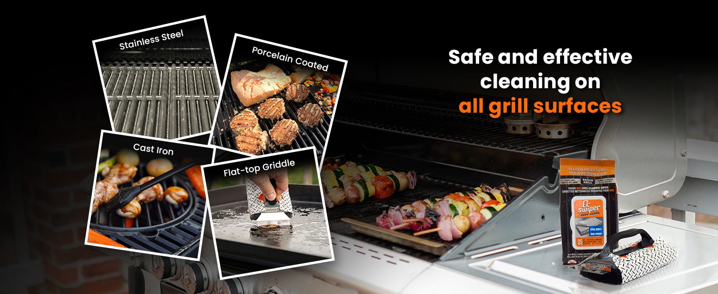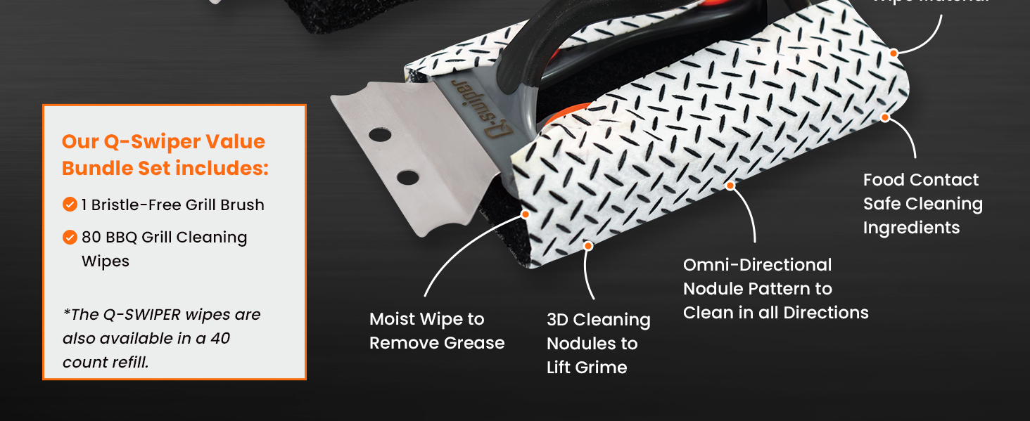 The Q-swiper is the perfect addition to your cookout. It makes cleanup so much easier. The comfortable handle and strong bristles are sure to last. I love the disposable cleaning pads easily remove grease and grime. Plus the wipes are made with natural cleaning agents to keep you and your food safe!