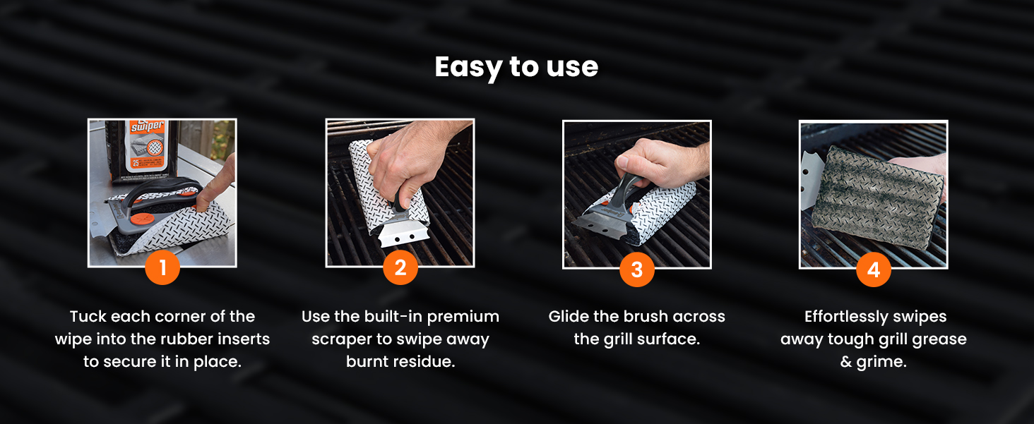 The Q-Swiper is the perfect companion to grilling! It makes clean up a breeze! Easy to attach the throw away cleaning cloth for an even quicker clean up! It worked magic on my flat top! Couldn’t recommend more!