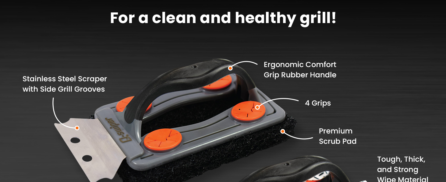 The Q-Swiper Grill Cleaner is perfect for tackling a very messy job. The scraper at the end gets rid of the big stuff and the disposable wipes which attach to the cleaner, picks up the rest. It’s really a nice product.