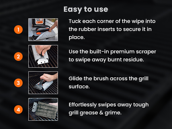 Easy to use – Attach disposable Grill Cleaning wipe to brush and use on a cool grill prior to grilling.